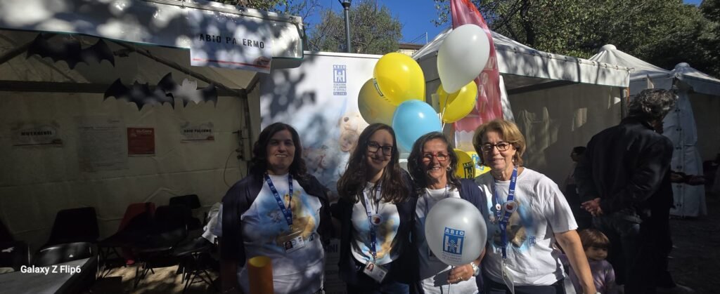 Simona Maria Prestileo, Valerio Sanchez e Frank Cottone ci presentano l’associazione Rock 10 e lode. Organizzano eventi musicali per giovani e anziani. Il 7 novembre al Teatro Jolly ci sarà la finale del Green Music Contest. Hanno pure regalato piante a dieci ville di Palermo. In occasione delle piantumazioni ci sono stati pure dei piccoli concerti. Erika Lo Sasso, Responsabile della Formazione dell’ABIO, mentre gonfia palloncini, ci chiarisce il mandato dell’Associazione per il bambino in ospedale. Gestiscono una ludoteca all’Ospedale dei bambini di Palermo. La loro missione è rendere meno traumatico possibile il passaggio dall’ospedale, per un ricovero o una visita, ai bambini.