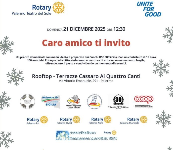 PALERMO. Un pranzo che diventa gesto concreto di vicinanza e condivisione. È lo spirito di “Caro amico ti invito…”, l’iniziativa solidale promossa dal Rotary Club Teatro del Sole insieme agli altri club dell’area Panormus, che offrirà a circa 100 persone in situazione di fragilità un pranzo natalizio e un momento di serenità.