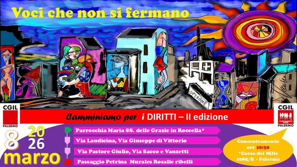 PALERMO. L’8 marzo alle ore 10.30 la Cgil Palermo e il Coordinamento donne della Cgil Palermo, con associazioni e realtà del territorio, saranno allo Sperone per la seconda edizione di “Camminiamo per i diritti”. La camminata, in occasione della Giornata internazionale dei diritti della donna, partirà dalla parrocchia di Santa Maria delle Grazie in Roccella e attraversando via Laudicina, via Giuseppe Di Vittorio, via Pastore Giulio, via Sacco e Vanzetti, Passaggio Petrina, si concluderà al murale Le Rosalie Ribelli. Nelle varie soste si alterneranno gli interventi, fino a quello conclusivo della segretaria Cgil Sicilia Gabriella Messina, davanti all’opera realizzata nell’ottobre 2024 da Giulio Rosk.