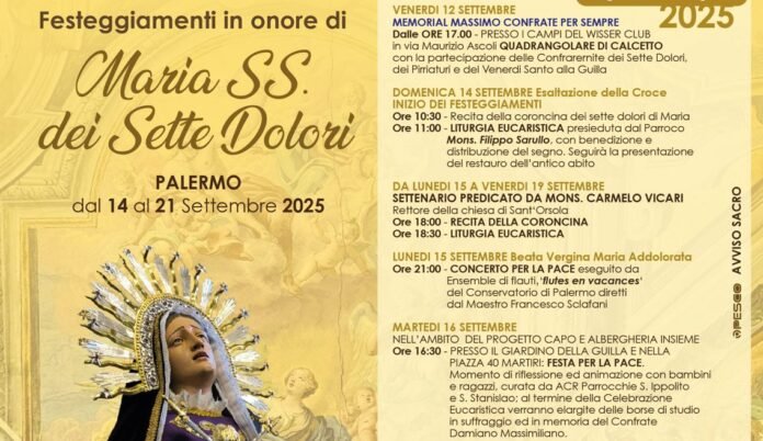 PALERMO. Nel quartiere Capo di Palermo, continua la settimana di festeggiamenti in onore di Maria SS. dei Sette Dolori organizzata dall’omonima confraternita. Ecco i prossimi appuntamenti.