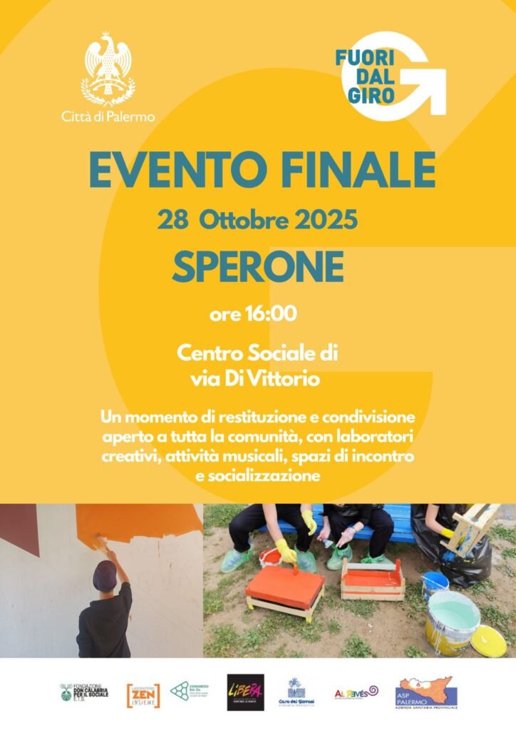 PALERMO. Un momento di restituzione e condivisione aperto alla cittadinanza, con laboratori creativi, attività musicali, spazi di incontro e socializzazione, quello di martedì 28 ottobre alle ore 16.00, presso il Centro sociale del quartiere Sperone, in viale Giuseppe Di Vittorio, per un’iniziativa finale del progetto “Fuori dal giro”, di contrasto alle dipendenze, sostenuto dal Comune di Palermo, in partenariato con Fondazione Don Calabria, Asp Palermo, Laboratorio Zen Insieme, Libera Palermo, Consorzio Sol.Co, Al Revés e Casa dei Giovani Comunità Terapeutica.