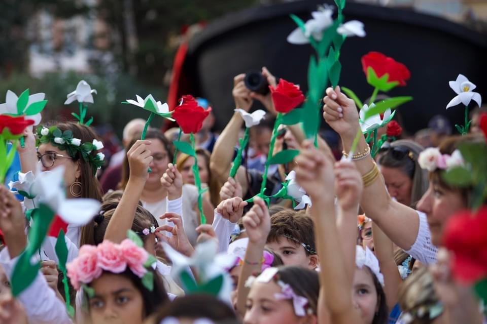 Location: via Sacco e Vanzetti, su strada, davanti al Carro che sarà stato posizionato sotto il murale Le Rosalie ribelli. Performance realizzata da bambine e bambini delle quinte primaria. Il quadro si apre con gli alunni delle classi quinte A e C vestiti di bianco e nero che rimanendo sul proprio posto simulano (senza contatto, senza armi, nemmeno di carta) momenti di colluttazioni e guerriglia, accompagnati da altri bambini che reggono cartoncini con su scritte le nazioni in guerra (attualmente 65 paesi con conflitti attivi). A un segnale delle insegnanti (o suono da diffondere con l’amplificazione, da concordare) i bambini di chinano su se stessi come a ripararsi dai colpi della guerra. Entrerà in scena un bambino/a che regge un cartello nel quale vengono rappresentate delle mani in atto di aiuto. A questo punto si inseriscono gli alunni della quinta B, costruttori di pace, con un grande manifesto sulla “costruzione della pace”: mattoncino su mattoncino saranno riportate a grandi lettere le cose che servono per costruire la pace (dialogo, fratellanza, condivisione, rispetto…). La compagine degli alunni si aprirà per dare spazio a Santa Rosalia, accompagnata dalla piccola Rosalia ribelle e dagli alunni delle classi quinte E, F, G, “seminatori di pace” che entreranno nel quadro spargendo polveri colorate su tutti i bambini, chinati e non. I bambini chinati si alzeranno e tutti quanti insieme festosamente si abbracceranno con il sottofondo di “One Love” di Bob Marley.