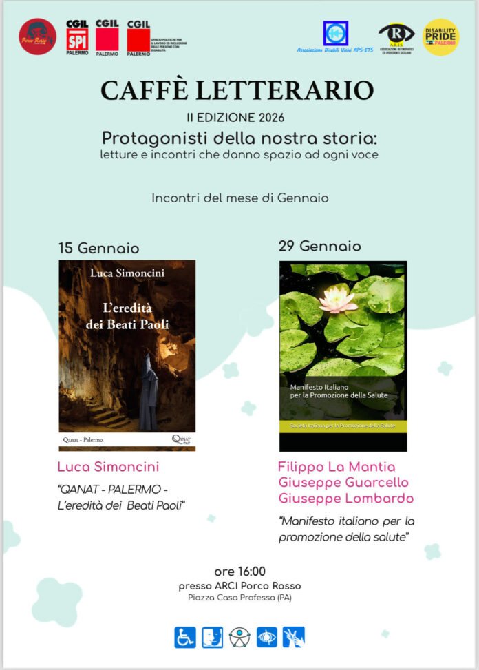 La nuova edizione di Caffè Letterario, che si svolgerà dal 15 gennaio al 25 giugno, è promosso da Cgil Palermo, Spi Cgil Palermo, Arci Palermo, Disability Pride Palermo, Associazione disabili visivi e Associazione retinopatici e ipovedenti siciliani e rappresenta un’importante occasione di incontro e scambio tra persone con disabilità e persone senza disabilità.