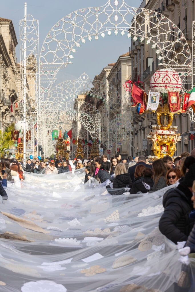 Tu Sei Agata è un’opera collettiva che celebra Sant’Agata come simbolo di forza, resistenza e rinascita. Cittadini, scuole, associazioni e comunità italiane e internazionali sono invitati a donare centrini, ricami, merletti e manufatti tessili che andranno a comporre un grande velo lungo un chilometro.