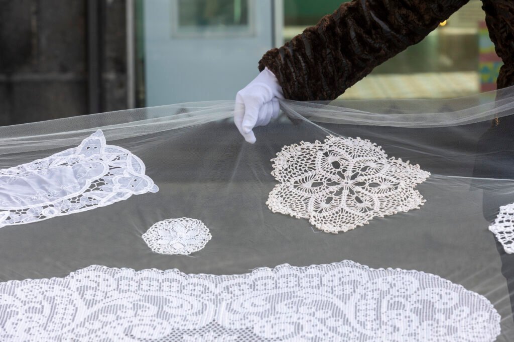 Il velo è costruito attraverso moduli tessili di 3×3 metri, cuciti grazie al lavoro di volontari e sartorie collettive. Ogni frammento custodisce una memoria familiare, un gesto di devozione, un legame con la tradizione.
