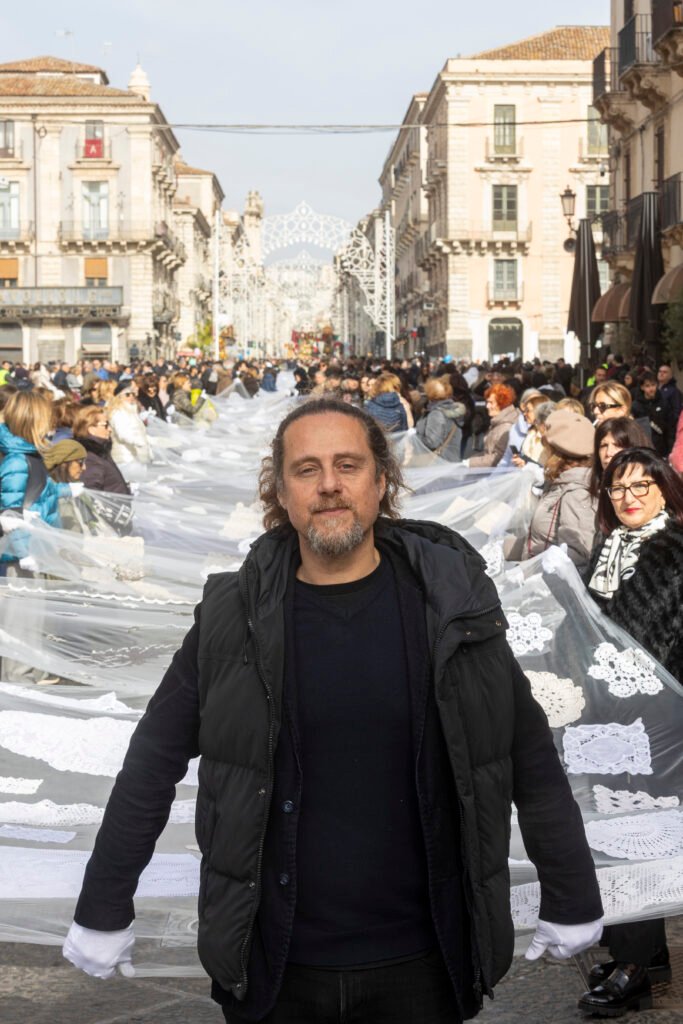 Domenico Pellegrino dichiara: “Un gesto collettivo di fiducia. Vedere oltre 350 persone camminare insieme lungo Via Etnea, tenendo un velo fatto di storie intime, memorie familiari e devozione, è stato profondamente commovente. Tu Sei Agata nasce dall’idea che l’arte possa diventare un corpo condiviso.”