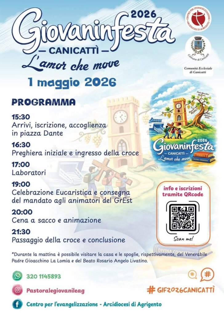 Sotto la guida del Centro per l’Evangelizzazione e il coordinamento di don Gerlando Casula e don Calogero Morgante, il Giovaninfesta 2026 si ispira al tema dantesco “L’Amor che move”, un invito a riscoprire la fede come forza viva capace di orientare il cammino e le scelte quotidiane.