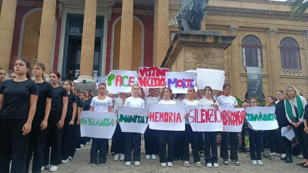 PALERMO. “Dentro ogni battito c’è la vita che non si arrende”. E’ stato un flash mob,dall’impatto forte e molto emozionante, per gridare la pace e per manifestare, con il linguaggio della musica e dell’arte, l’impegno per la difesa dei diritti umani della popolazione di Gaza. In questo modo, questa mattina, sulla scalinata monumentale del Teatro Massimo, 200 giovani, guidati dagli insegnanti/e, hanno messo in scena la performance con danze, canti e ritmi di trombe e tamburi. Il flash mob è stato realizzato dai ragazzi e dalle ragazze del Liceo Musicale e Coreutico Regina Margherita e dell’Istituto Comprensivo Karol Wojtyla-Arenella che, con le loro magliette colorate, hanno rappresentato la bandiera della Palestina.