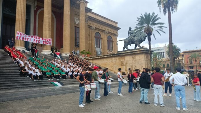PALERMO. “Dentro ogni battito c’è la vita che non si arrende”. E’ stato un flash mob,dall’impatto forte e molto emozionante, per gridare la pace e per manifestare, con il linguaggio della musica e dell’arte, l’impegno per la difesa dei diritti umani della popolazione di Gaza. In questo modo, questa mattina, sulla scalinata monumentale del Teatro Massimo, 200 giovani, guidati dagli insegnanti/e, hanno messo in scena la performance con danze, canti e ritmi di trombe e tamburi. Il flash mob è stato realizzato dai ragazzi e dalle ragazze del Liceo Musicale e Coreutico Regina Margherita e dell’Istituto Comprensivo Karol Wojtyla-Arenella che, con le loro magliette colorate, hanno rappresentato la bandiera della Palestina.