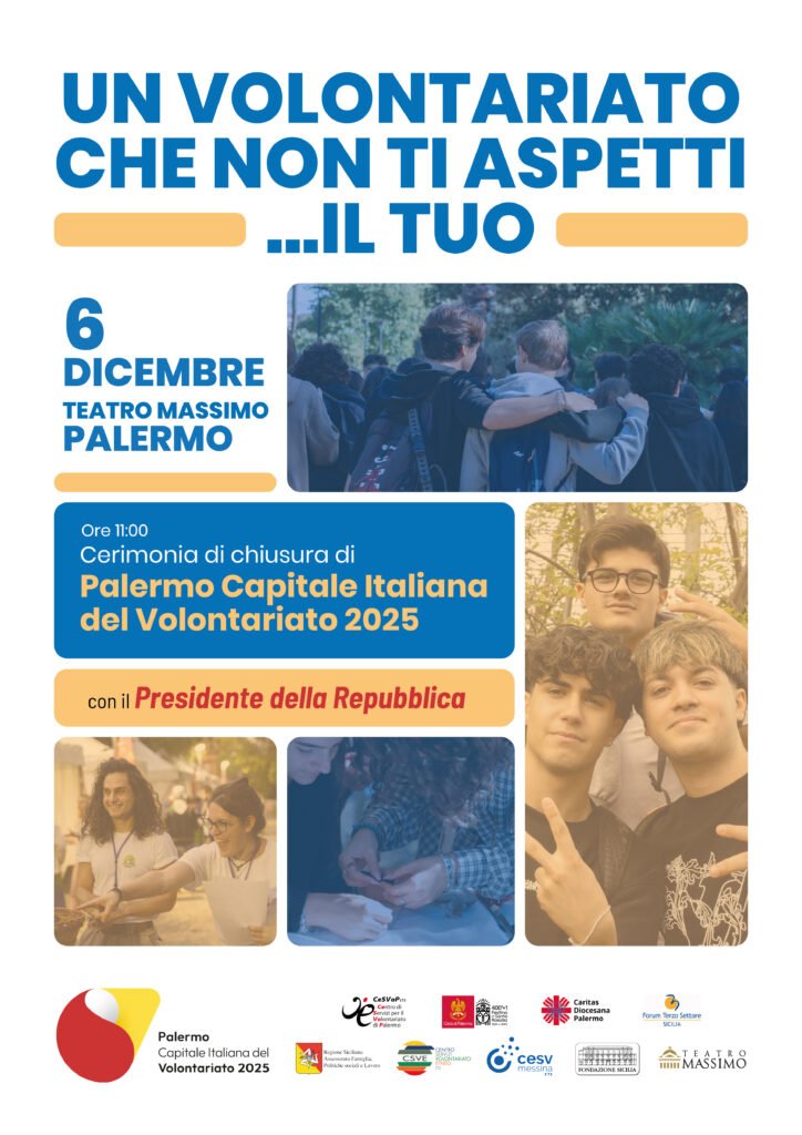 PALERMO. Sabato 6 dicembre 2025, alle ore 11, al Teatro Massimo di Palermo, si svolgerà la cerimonia di chiusura di Palermo Capitale Italiana del Volontariato 2025. L’iniziativa si terrà alla presenza del Presidente della Repubblica, Sergio Mattarella, di rappresentanti delle istituzioni, civili e religiose, e del Terzo settore. Nel corso della cerimonia sono previste, fra l’altro, le testimonianze di Chiara Runfolo, Alfiere della Repubblica, e di Matilda Guagliardito, giovani protagoniste di percorsi di cittadinanza attiva e impegno sociale. Due dei tanti volti che mostrano l’importanza del volontariato giovanile in città. Quindi, il passaggio di testimone della Capitale Italiana del Volontariato, da Palermo, alla nuova città designata per il 2026, Modena. Sarà possibile seguire l’evento anche in diretta streaming sul canale YouTube del CeSVoP (https://www.youtube.com/@cesvop1/streams), per permettere la partecipazione più ampia possibile di volontari, operatori e cittadini.