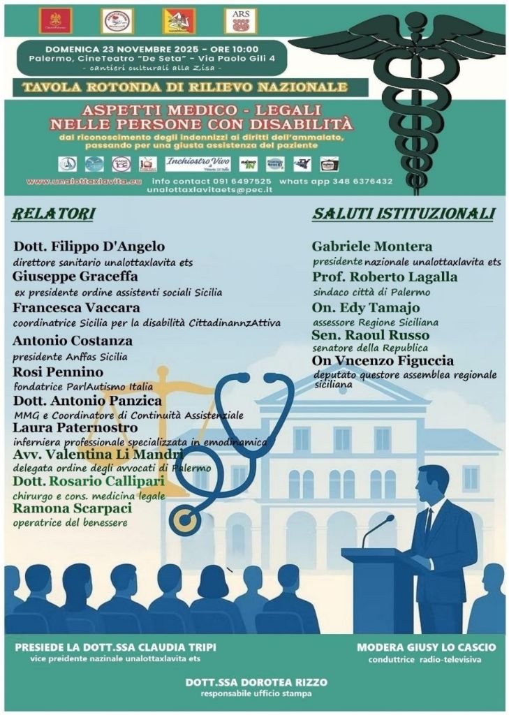 L’associazione no profit “Unalottaxlavita ETS”, realtà del terzo settore con sede legale a Corigliano-Rossano (Calabria) e sede operativa nel capoluogo siciliano, organizza una tavola rotonda dedicata agli aspetti medico-legali legati alla disabilità, dal titolo “Gli aspetti medico-legali nelle persone con disabilità: dal riconoscimento degli indennizzi ai diritti degli ammalati, passando per una giusta assistenza del paziente”.