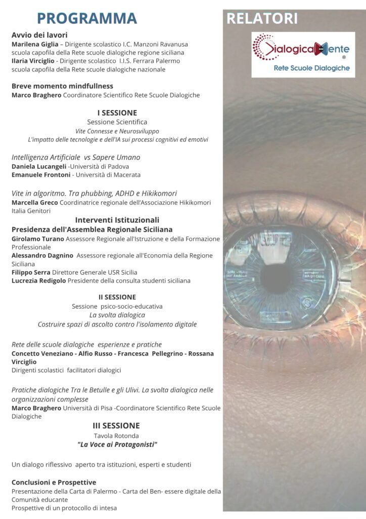 Il programma dell’appuntamento del 17 aprile a Palermo esplora le sfide del mondo digitale attraverso il tema “Vite Connesse e Neurosviluppo”, analizzando l’impatto dell’IA e delle tecnologie sui processi cognitivi. Dopo l’apertura dei lavori a cura delle dirigenti Marilena Giglia e Ilaria Virciglio e un momento di mindfulness guidato da Marco Braghero, la I Sessione scientifica mette a confronto esperti come Daniela Lucangeli ed Emanuele Frontoni, toccando criticità moderne come il phubbing e l’isolamento da Hikikomori. Segue una sezione di Interventi Istituzionali di alto profilo, con la partecipazione degli assessori regionali siciliani Girolamo Turano e Alessandro Dagnino, insieme al Direttore dell’USR Sicilia Filippo Serra. La II Sessione si concentra sulla “svolta dialogica” come strumento per costruire spazi di ascolto e contrastare l’isolamento, portando le esperienze pratiche di diversi dirigenti scolastici. La giornata si chiude con una tavola rotonda partecipativa e la presentazione della “Carta di Palermo” per il benessere digitale della comunità educante.