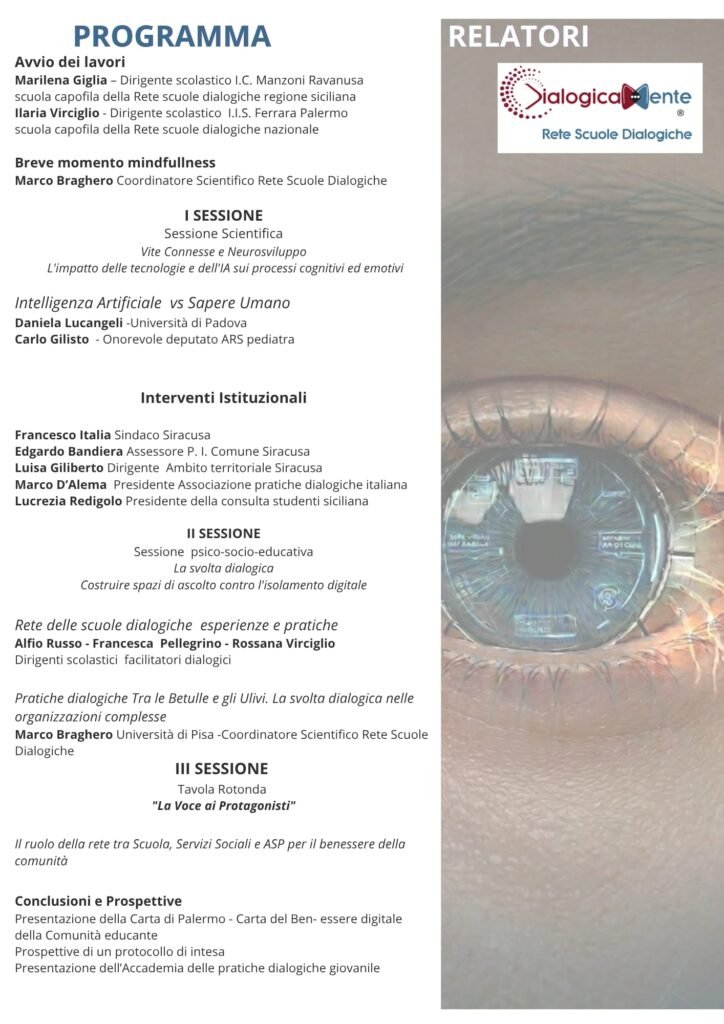PALERMO. Un convegno itinerante per riflettere sulle nuove sfide educative nell’era digitale. Il 17 e 18 aprile, tra Palermo e Siracusa, la Rete Scuole Dialogiche Sicilia promuove due giornate di studio e confronto dedicate al benessere mentale e alla tutela del neurosviluppo degli studenti, attraverso l’approccio dialogico.