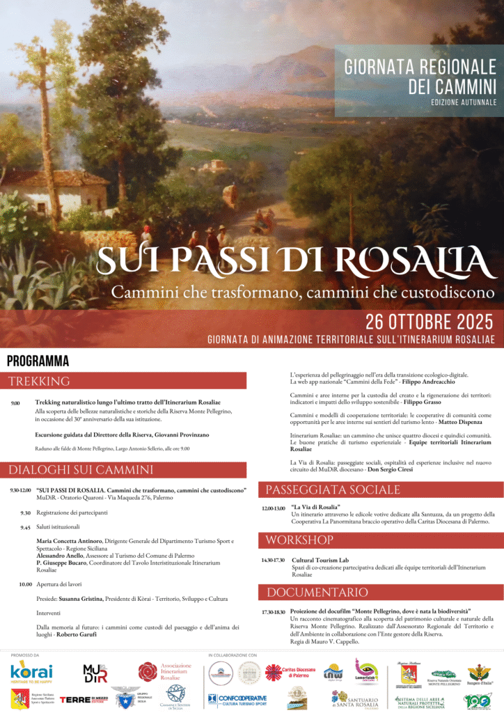 L’iniziativa, dal titolo “SUI PASSI DI ROSALIA. Cammini che trasformano, cammini che custodiscono”, si terrà domenica 26 ottobre 2025 presso il MuDiR – Oratorio Quaroni (via Maqueda 276, Palermo) e rappresenta un momento di riflessione, confronto e partecipazione dedicato al valore dei cammini come strumenti di sviluppo sostenibile, rigenerazione culturale e coesione sociale.