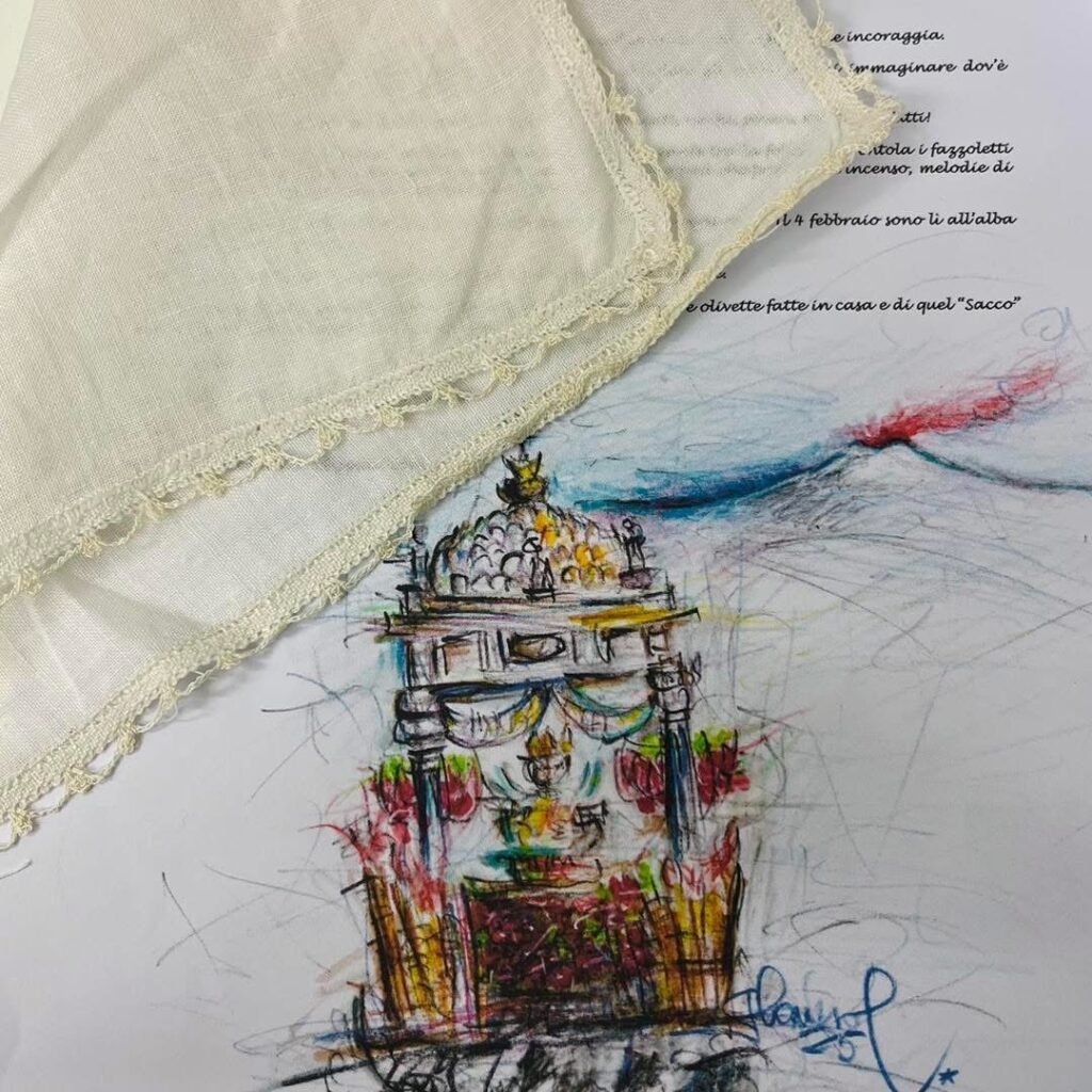 Accanto al velo tessile, l’artista realizzerà per i festeggiamenti estivi un ritratto luminoso di Sant’Agata, utilizzando la sua cifra stilistica legata alle luminarie, che accompagnerà l’opera come simbolo di luce, resistenza e rinascita.