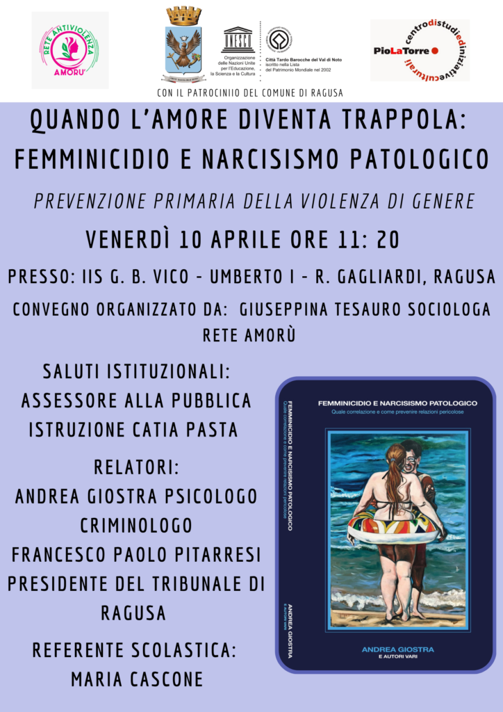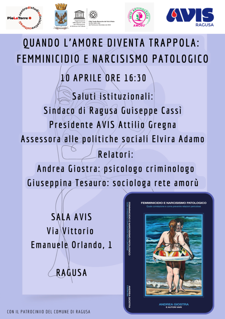 RAGUSA. “Quando l’amore diventa trappola: femminicidio e narcisismo patologico” è il tema della giornata che si svolgerà venerdì 10 aprile a Ragusa, promosso nell’ambito del progetto “Amorù” volto a sensibilizzare la popolazione locale sul fenomeno della violenza attraverso percorsi di affettività e assertività anche nelle scuole, per dare modo alle nuove generazioni di comprendere che rispettare se stessi e gli altri costituisce il sicuro antidoto a qualunque forma di discriminazione.