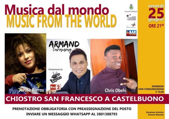 CASTELBUONO. Si svolgerà venerdì 25 giugno, dalle 21, nel Chiostro San Francesco a Castelbuono la serata musicale “Musica dal mondo – Music from the world” che vedrà esibirsi sul palco del seicentesco complesso manumentale Jerusa Barros, Armand Curameng e Chris Obehi. Sarà il primo appuntamento dell’estate castelbuonese. Nel corso della serata Jerusa Barros e Armand Curameng duetteranno “Vivo per lei” mentre insieme a Chris Obehi chiuderanno l’appuntamento castelbuonese cantando “We are the world”.