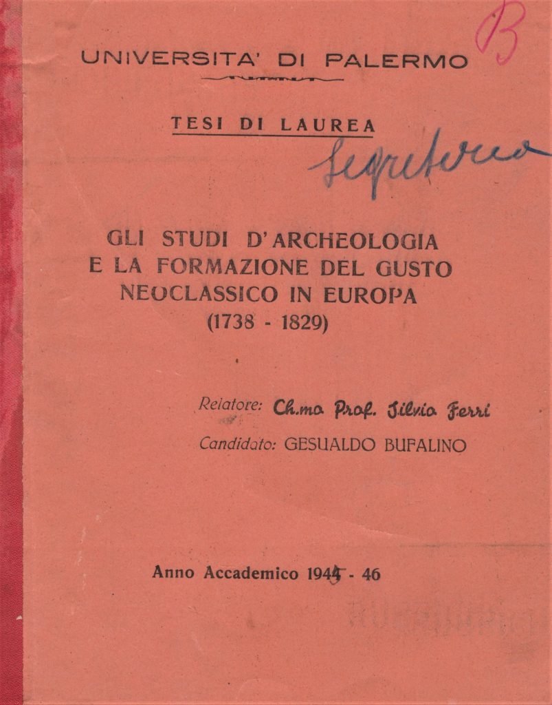 Ritrovata durante i lavori di trasferimento del materiale custodito nell’Archivio storico dell’Università di Palermo nei nuovi locali del convento seicentesco di Sant’Antonino, la copia destinata alla segreteria della tesi di laurea di Gesualdo Bufalino. Il dattiloscritto di 90 pagine reca sul frontespizio il titolo “Gli studi di archeologia e la formazione del gusto neoclassico in Europa (1738 – 1829)” e l’indicazione dell’anno accademico 1945-1946. In realtà lo scrittore comisano si sarebbe laureato a Palermo nel marzo del 1947, dopo avere ripreso gli studi intrapresi a Catania e interrotti bruscamente per la chiamata alle armi, sotto la guida del noto antifascista toscano Silvio Ferri, che dal 1° dicembre del 1940 insegnava archeologia nell’Ateneo palermitano.